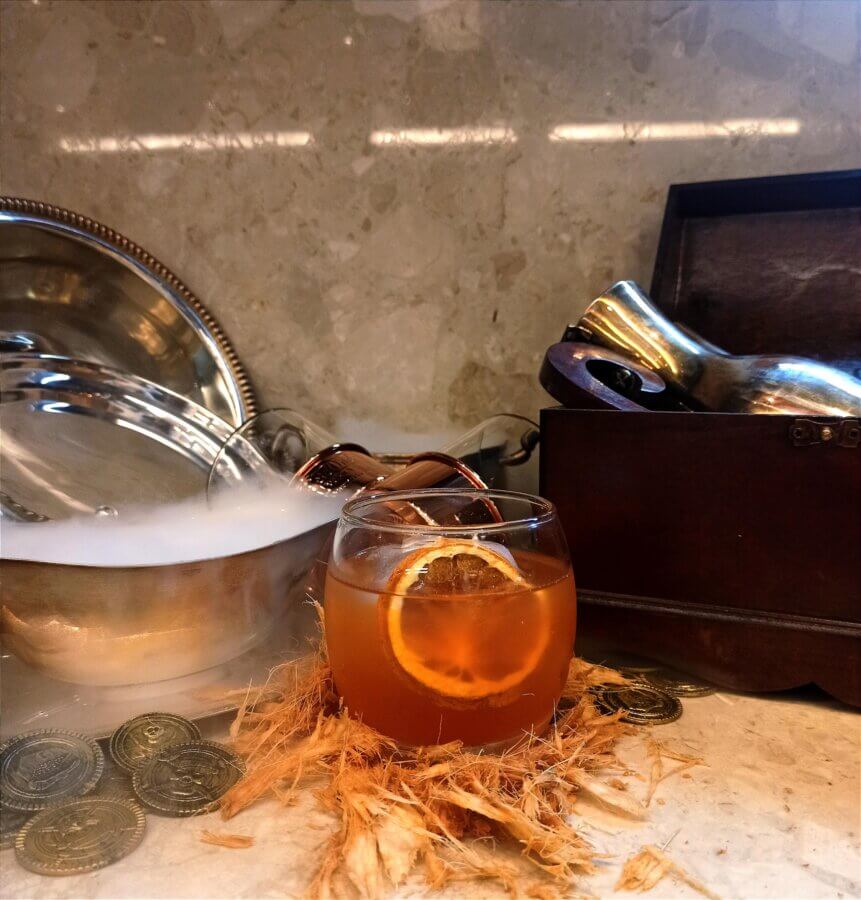 O coquetel se assemelha ao Medalhão do Baú de Cortez, o Ouro Asteca da Ilha da Morte. A cor do mesmo chega próxima ao bronze do medalhão. Os ingredientes fazem referência a vida nos filmes com consumo do Rum abundante, Maracujá e Laranja principais frutas da culinária no filme, Abacaxi e Coco sendo as referências das frutas usadas nas fugas do Capitão Jack Sparrow. Com finalização da laranja desidratada assemelhando-se também a outra peça do Ouro Asteca e a defumação como a névoa sempre presente no filme.